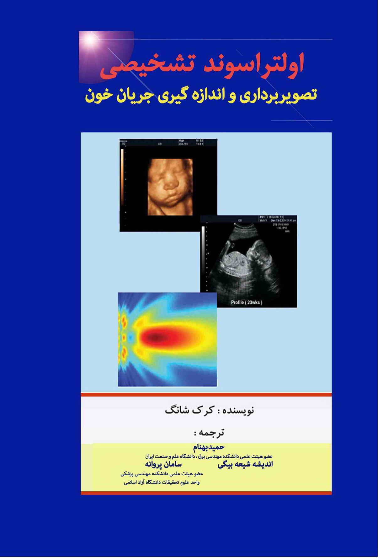 | ۳- اولتراسوند تشخيصی: تصويربرداری و اندازهگيری جريان خون. مولف: كرك شانگ. مترجمين: حميد بهنام، سامان پروانه و انديشه شيعهبيگی، ۱۳۸۸ (شابك ۹-۱۸۸۱-۰۴-۹۶۴-۹۷۸) جلد کتاب، مشخصات کتاب مرکز پخش: خيابان انقلاب، خيابان شهدای ژاندارمری، بين فروردين و ارديبهشت، پلاك ۱۱۵، انتشارات اشراقیه |